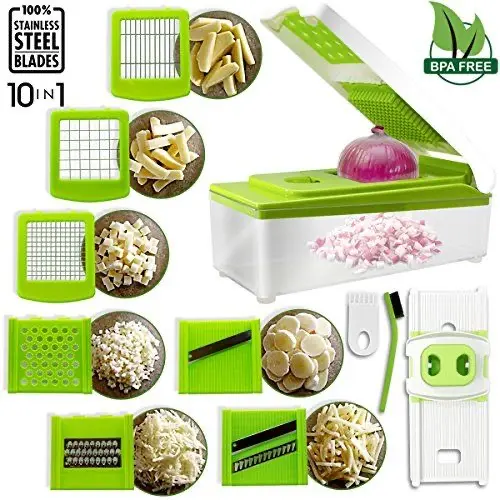 Mandolina multifunción 12 en 1, ideal para cortar, rallar y picar todo tipo de vegetales y frutas en segundos. Incluye 5 cuchillas intercambiables de acero inoxidable para hasta 22 tipos de cortes diferentes: cubos, bastones, rodajas, rallado fino, grueso y más. Viene con recipiente contenedor, pelador y accesorios de seguridad para una preparación fácil y rápida. Perfecta para ahorrar tiempo en la cocina y obtener cortes uniformes.